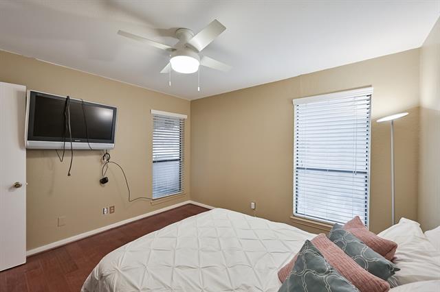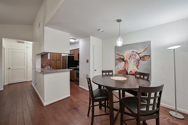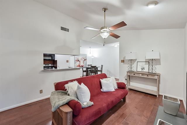 5 minutes to Globe Life Field, AT&T Stadium, Six Flags, Hurricane Harbor and MUCH MORE! Highly coveted Cloisters condo that is well updated with Granite Counters and Stainless Steel appliances to include the fridge. Gorgeous wood floors throughout the home. New modern flush mount ceiling fan in the master bedroom. Mounted TV and mount stay. Updated tile shower and tub combo with dual sinks and updated fixtures in the bathroom. Plenty of room for the stacked washer and dryer unit that stays with the home as well. Private balcony with storage closet and extended range antenna for cost-free TV viewing. Gated community and Activity filled complex with 2 pools, 2 hot tubs, sauna, huge area for a cookout with guests, tennis courts, racquetball courts, fitness gym, and large clubhouse.